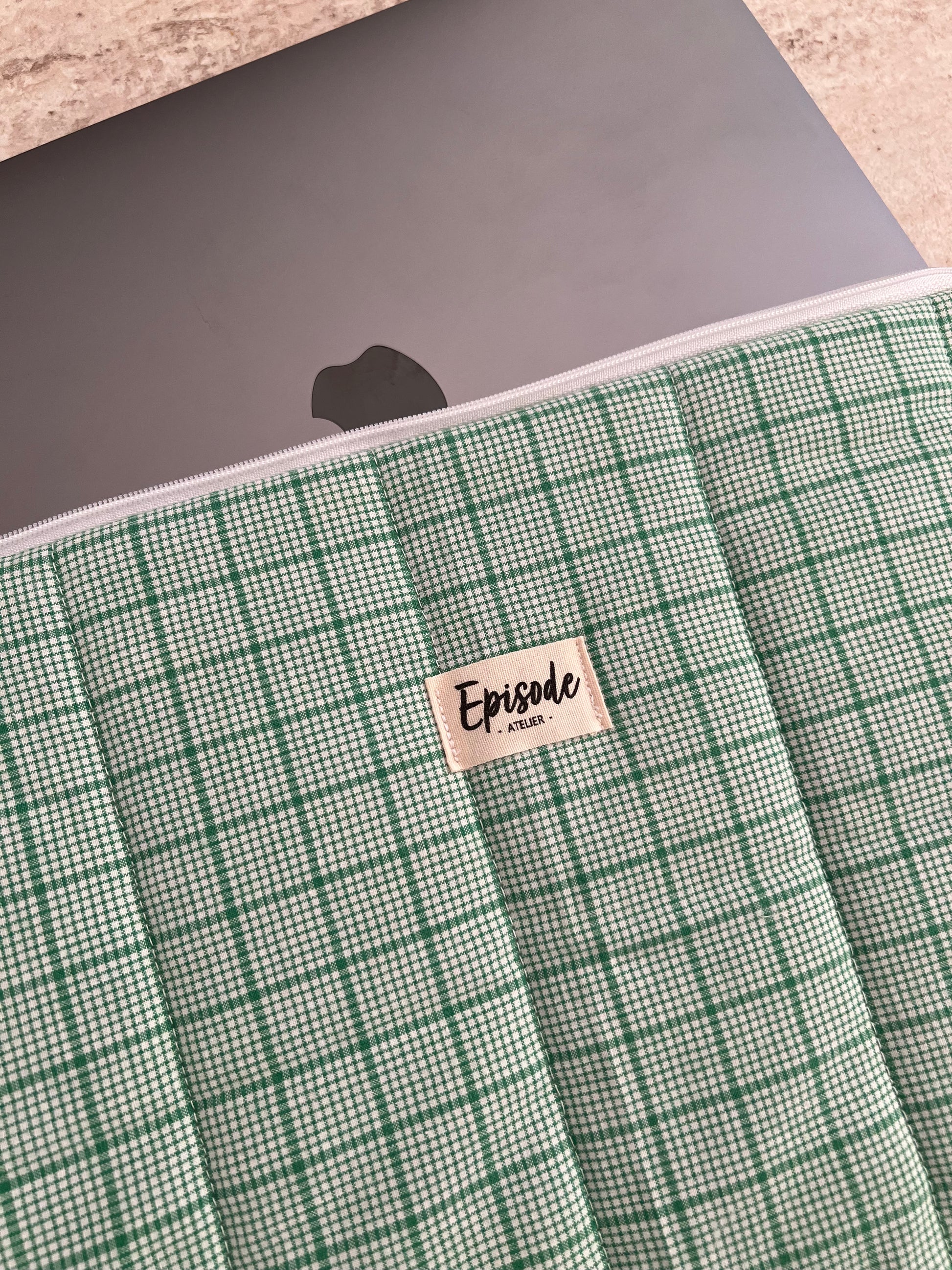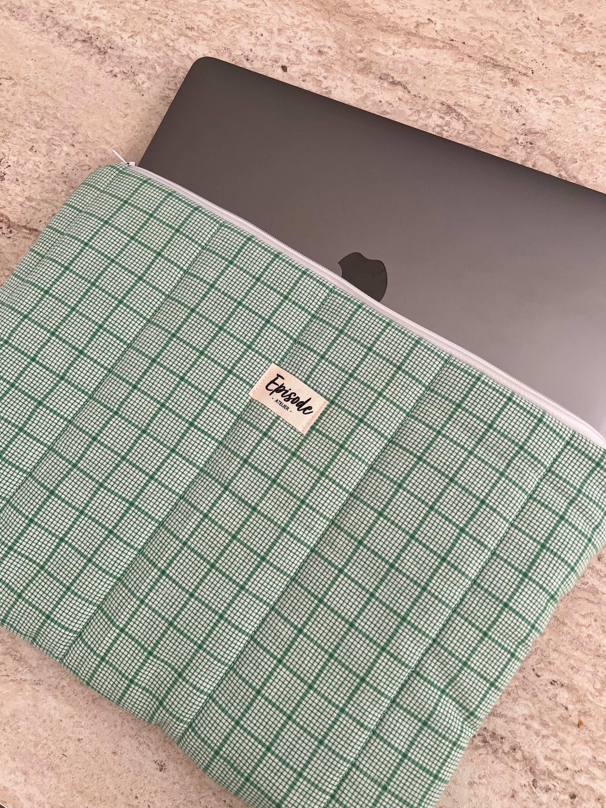 Protégez votre ordinateur avec style et conscience grâce à cette housse unique, confectionnée à partir de linge de maison revalorisé.